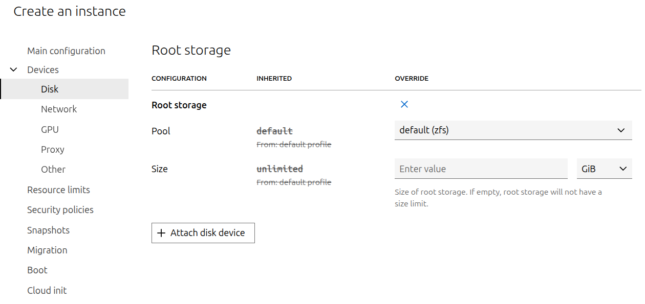 Instance storage volumes are created in the storage pool that is specified by the instance’s root disk device. This configuration is normally provided by the profile or profiles applied to the instance. See Default storage pool for detailed information.